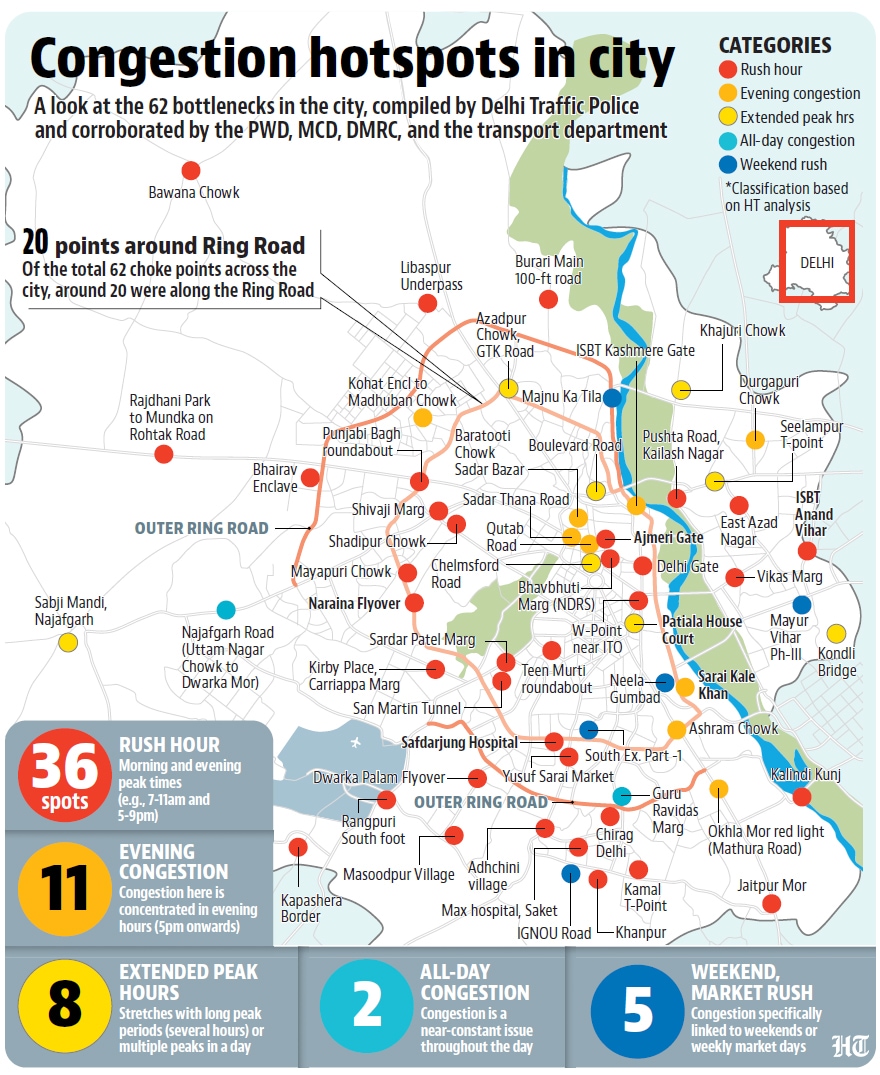 The Delhi government has identified 62 traffic congestion hot spots across the Capital โ€“ choke points that officials said are adding a โ€œmeasurable layerโ€ to the cityโ€™s pollution load โ€“ after drawing up a citywide, multi-agency decongestion blueprint, officials said on Friday.